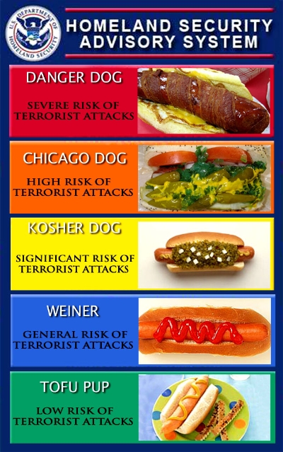 I stopped paying attention to the Homeland Security Advisory System after I spent a small fortune on plastic sheeting , packing tape, batteries and water in case of the anticipated drop of anthrax and/or possible radioactive fallout. So you’re more up on the current news…are we up to a Chicago Dog yet? Still at a Kosher Dog? 🙄 Luv U Man!!